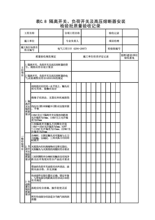 表格名称:表C.8 隔离开关、负荷开关及高压熔断器安装工程检验批质量验收记录