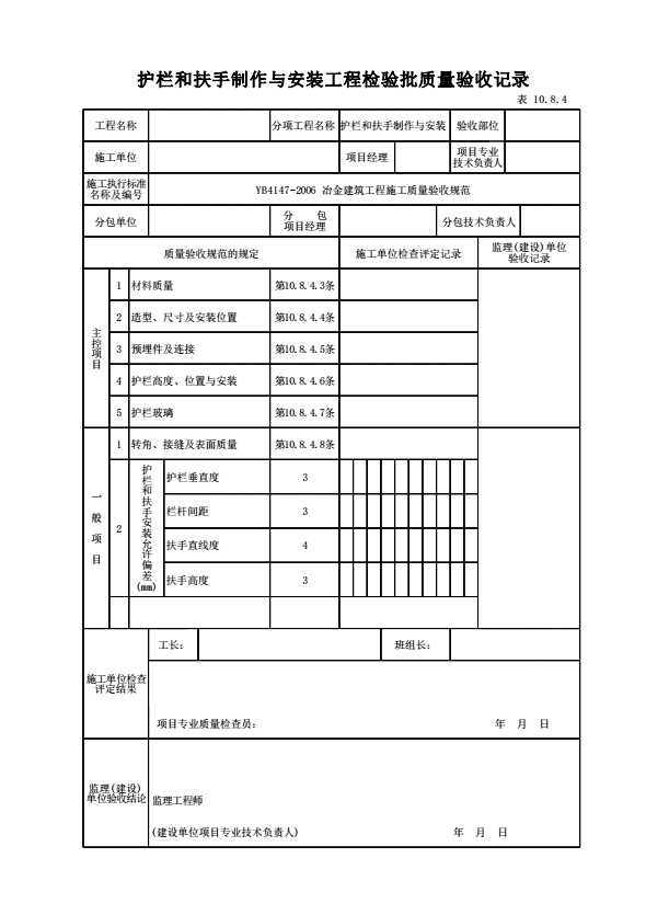 表格名称:表10.8.4 护栏和扶手制作与安装工程检验批质量验收记录