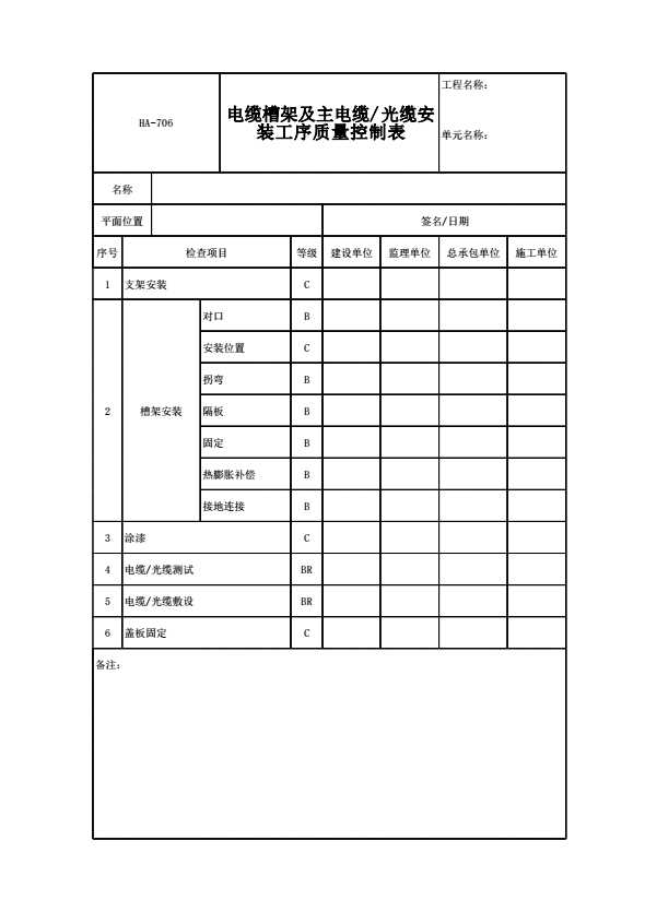 表格名称:HA-706 电缆槽架及主电缆光缆安装工序质量控制表