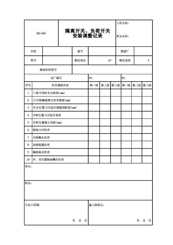 表格名称:HB-606 隔离开关、负荷开关安装调整记录