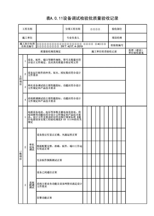 表格名称:表A.0.11 设备调试检验批质量验收记录