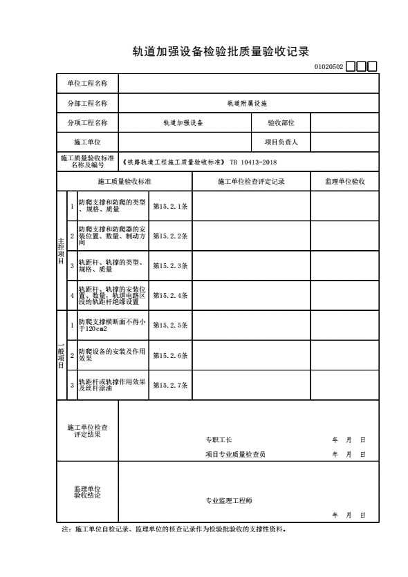 表格名称:01020502 轨道加强设备检验批质量验收记录
