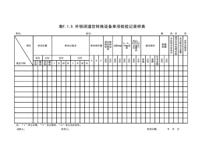 表格名称:表F.1.5 外锁闭道岔转换设备单项检验记录样表