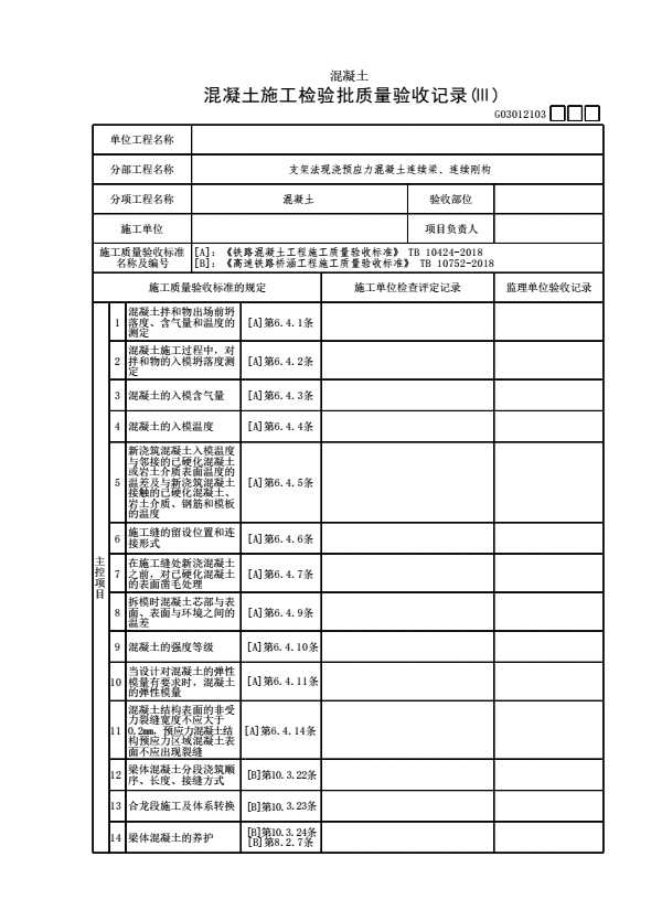 表格名称:G03012103 【混凝土】混凝土施工检验批质量验收记录(Ⅲ)