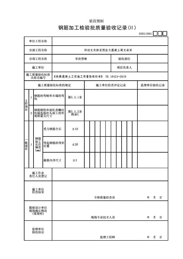 表格名称:03011801 钢筋加工检验批质量验收记录(Ⅱ)