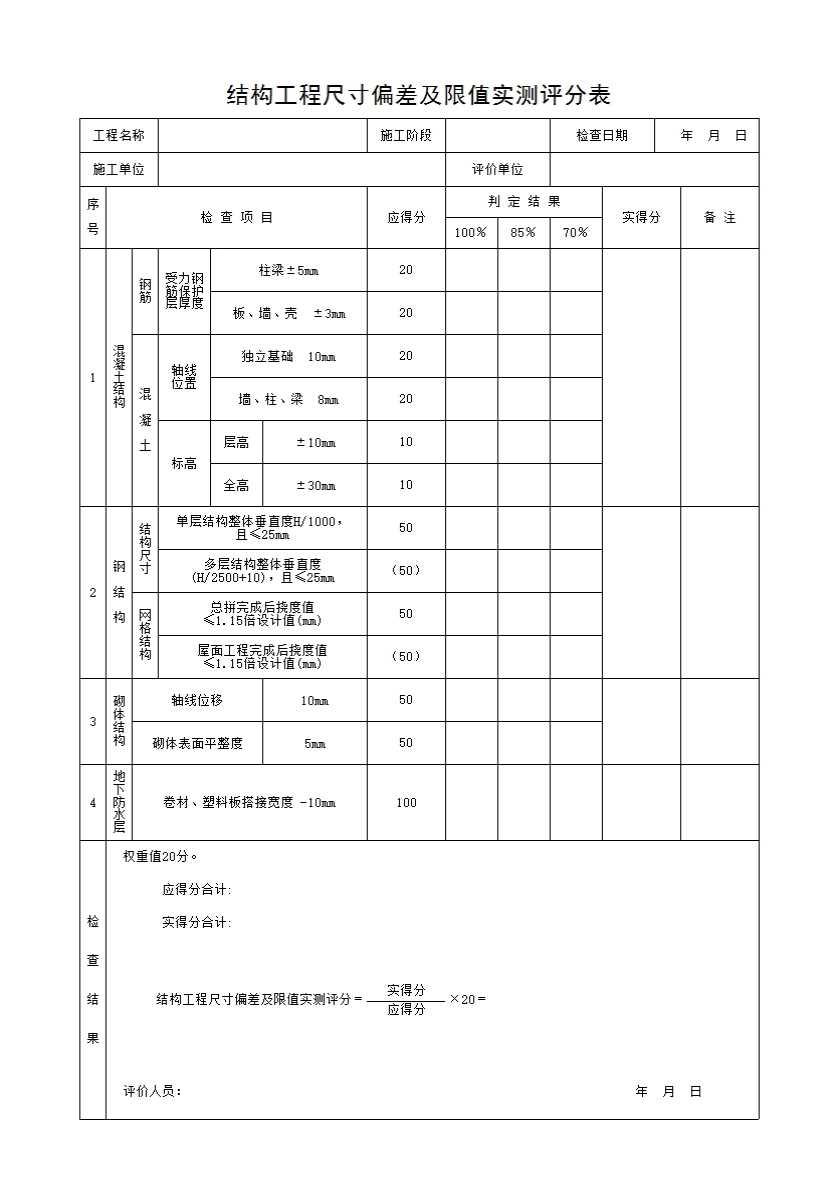 表格名称:结构工程尺寸偏差及限值实测评分表
