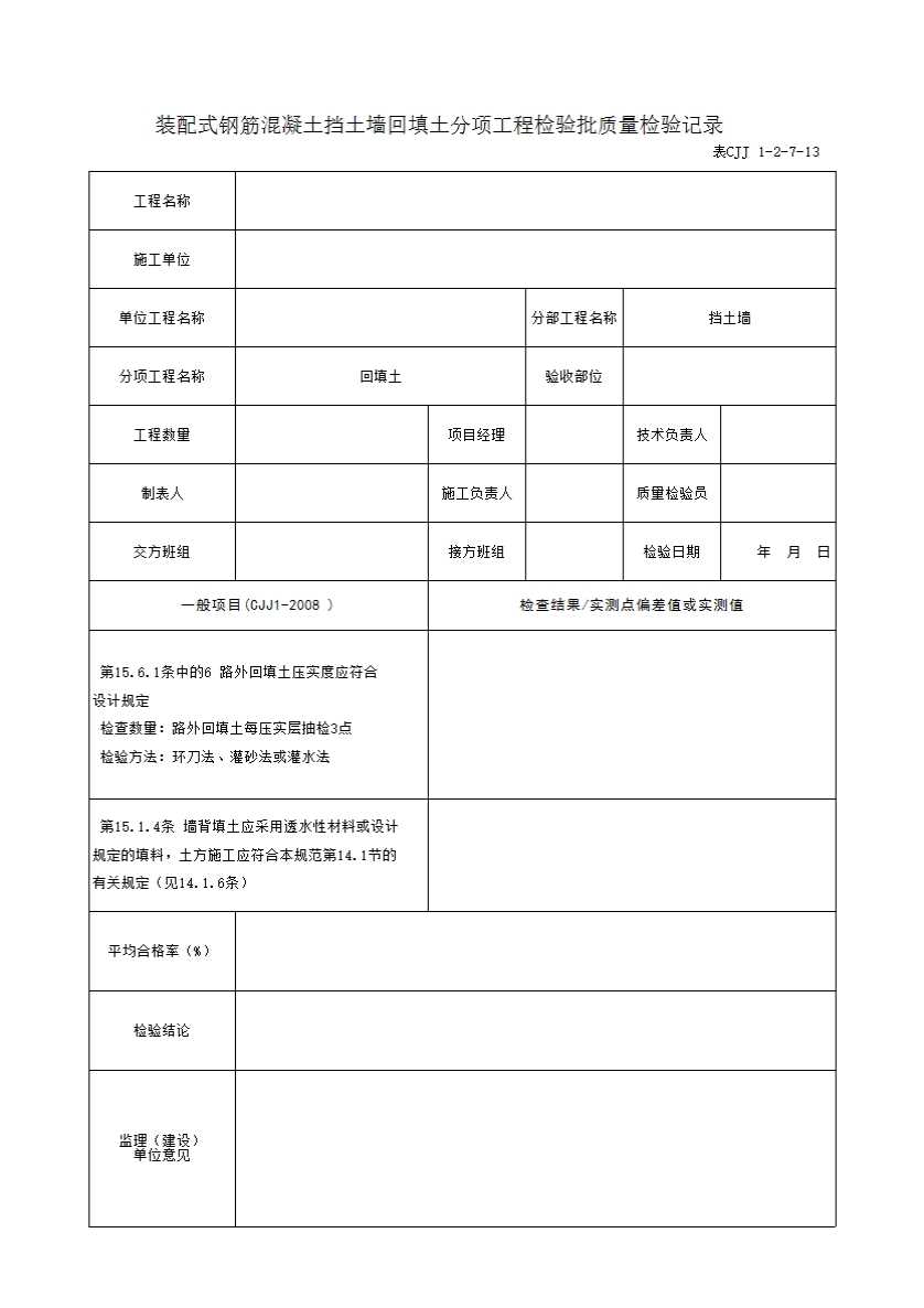 表CJJ 1-2-7-13 装配式钢筋混凝土挡土墙回填土分项工程检验批质量检验记录