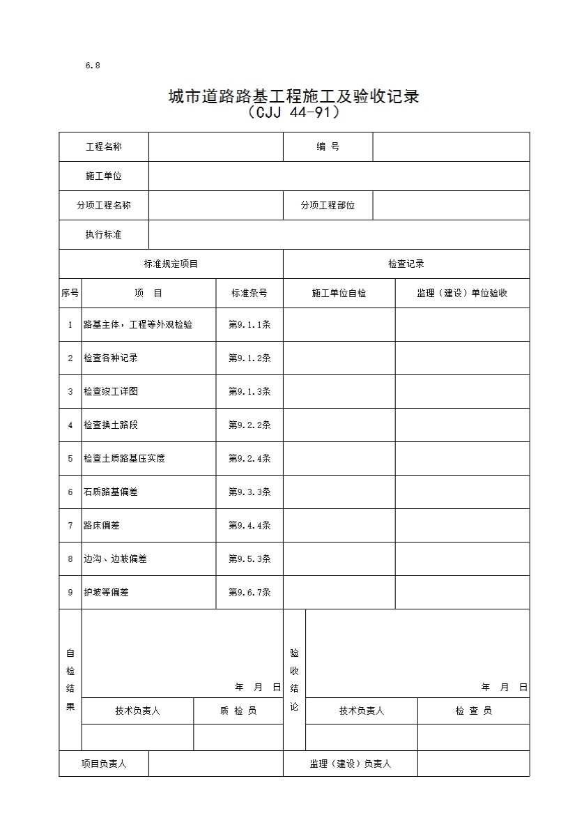表格名称:6.8 城市道路路基工程施工及验收记录