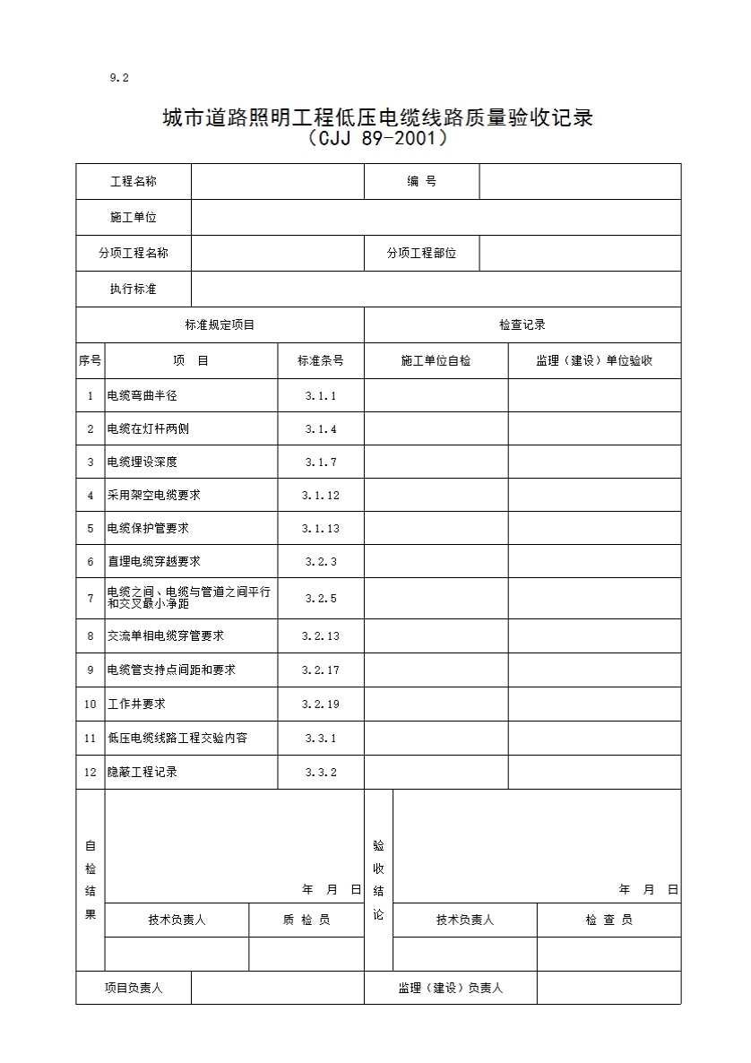9.2 城市道路照明工程低压电缆线路质量验收记录