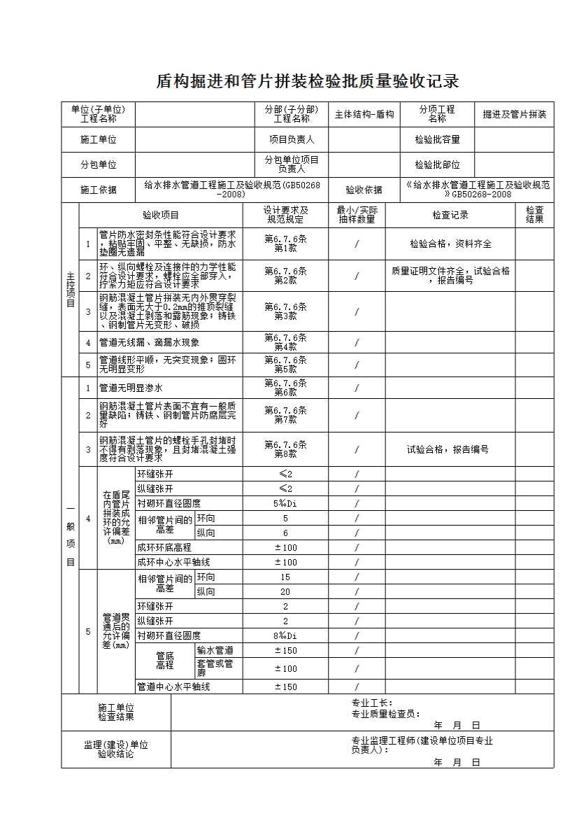 3.钢筋混凝土管片拼装无内外贯穿裂缝,表面无大于0.2mm的推顶裂缝以及混凝土剥落和露筋现象;铸铁、钢制管片无变形、破损;