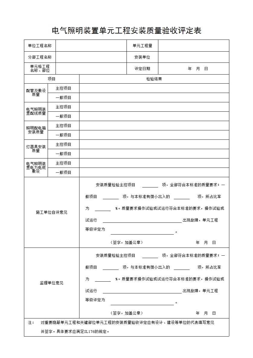 表格名称:电气照明装置单元工程安装质量验收评定表