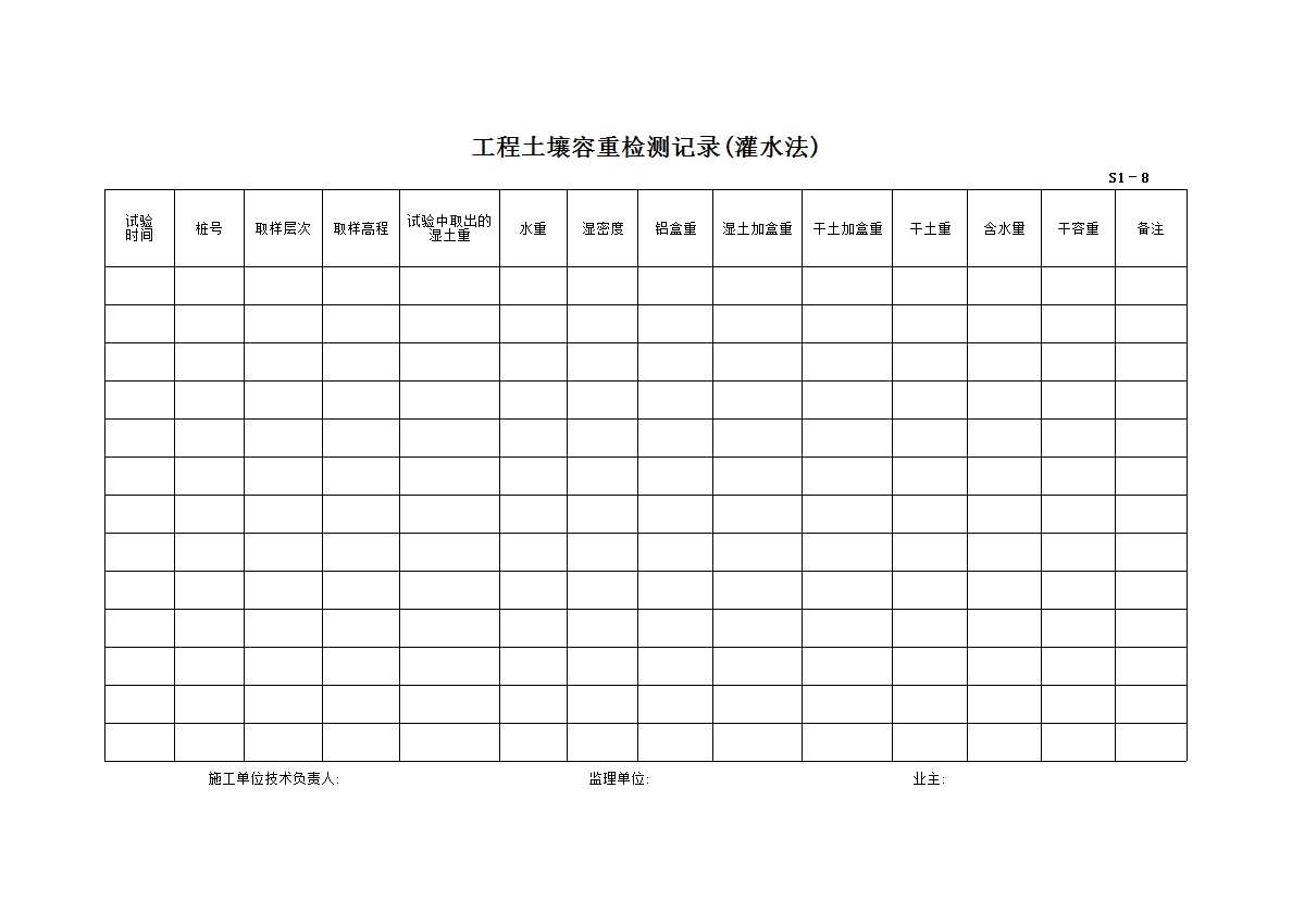 表格名称:S1-8 工程土壤容重检测记录(灌水法)