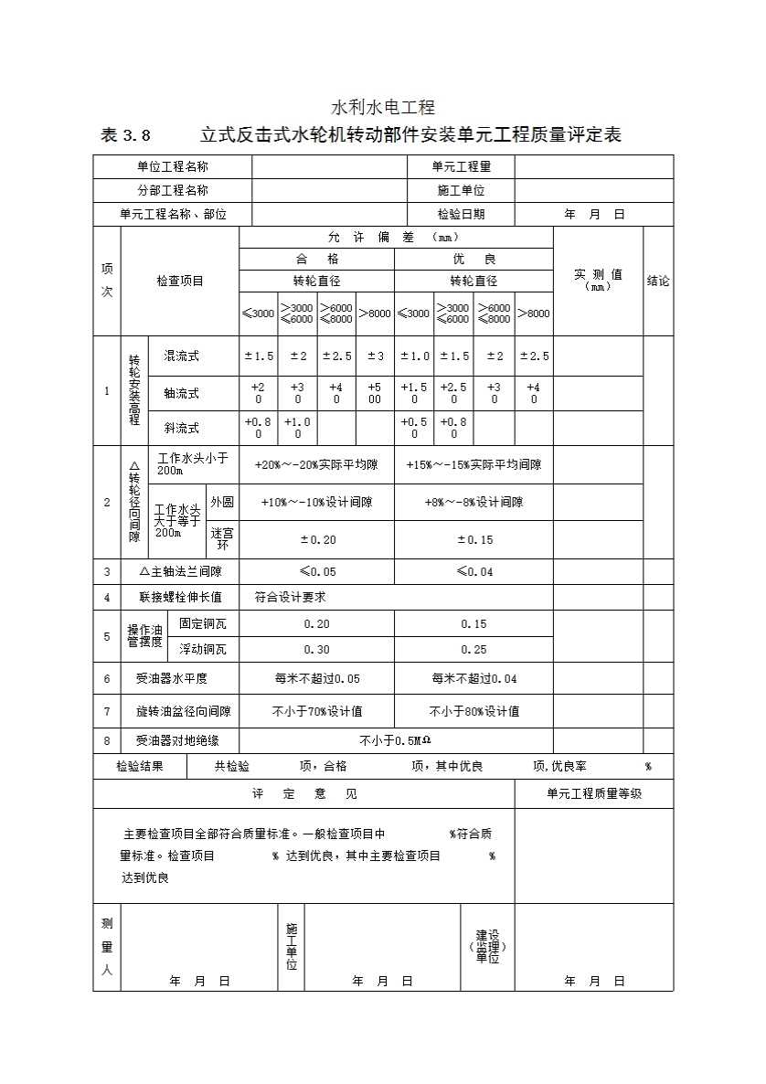 表格名称:表3.8 立式反击式水轮机转动部件安装单元工程质量评定表