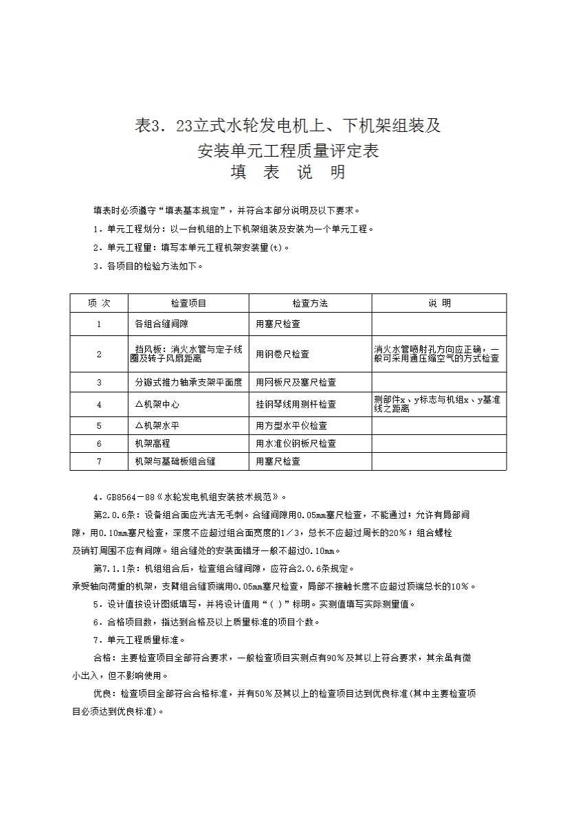 表格名称:表3.23 立式水轮发电机上、下机架组装及安装单元工程质量评定表