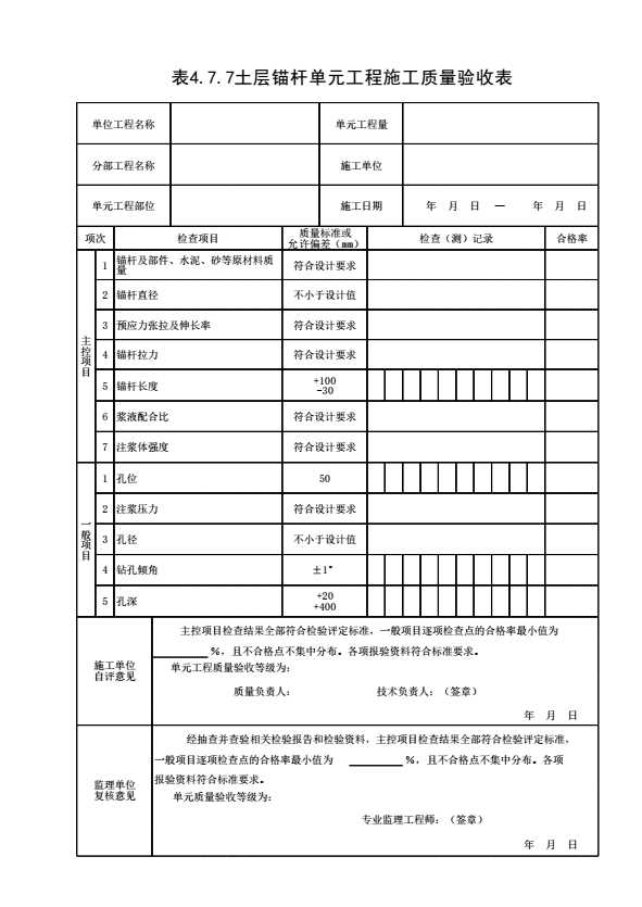 表格名称:表4.7.7 土层锚杆单元工程施工质量验收表