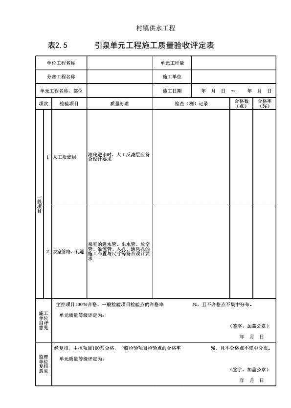 表格名称:表2.5 引泉单元工程施工质量验收评定表