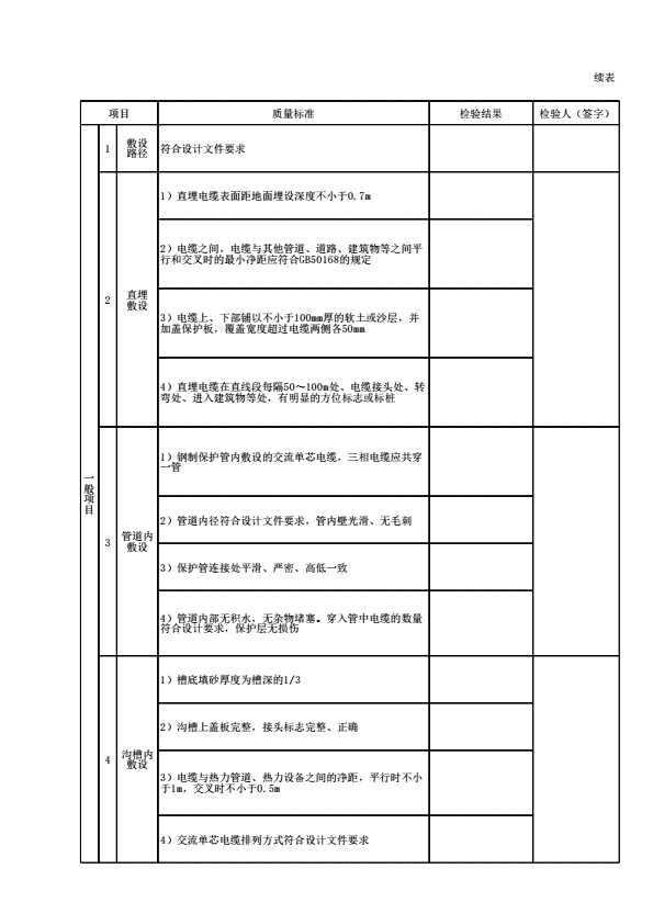 表8.7.4 35KV 以下电力电缆敷设单元工程安装质量检查表