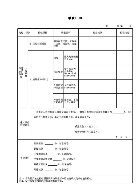 表1.13 反滤(过渡)料填筑单元工程施工质量检验表