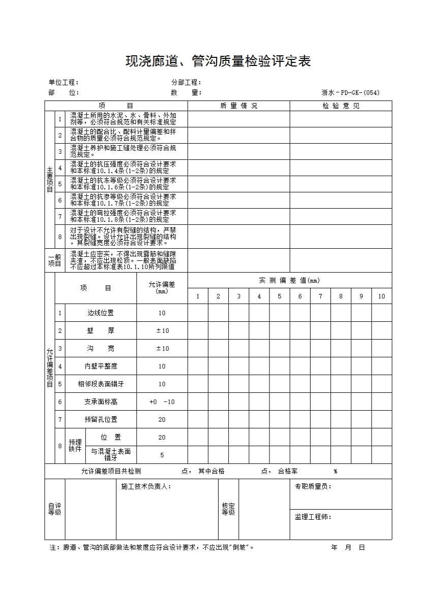 表格名称:054 现浇廊道、管沟质量检验评定表