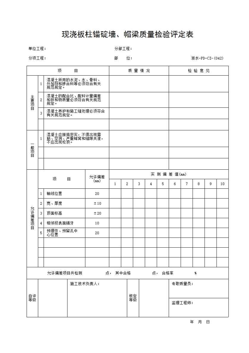 表格名称:042 现浇板柱锚碇墙、帽梁质量检验评定表