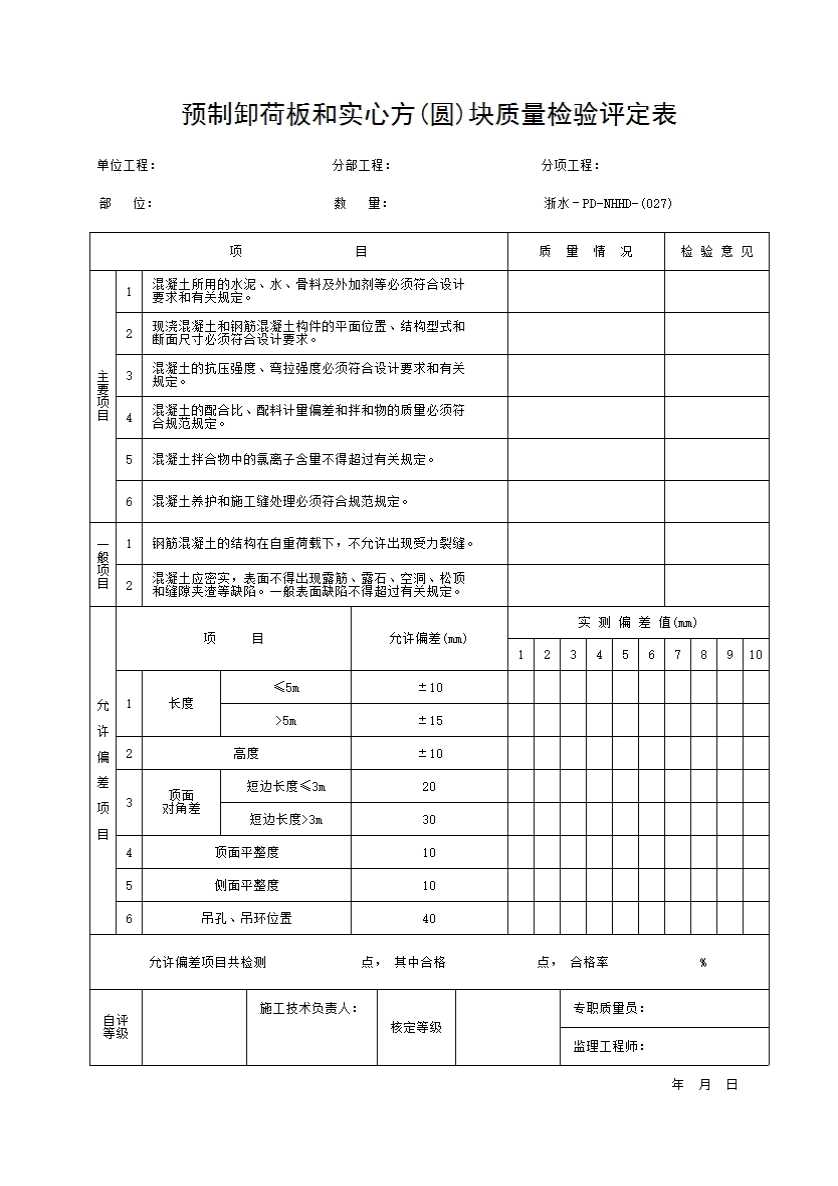 表格名称:027 预制卸荷板和实心方(圆)块质量检验评定表