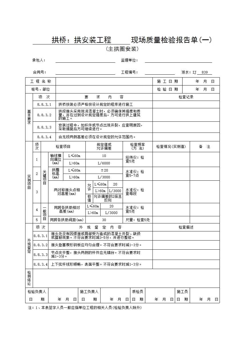 表格名称:浙水:ZJ839 拱桥:拱安装工程现场质量检验报告单(一)