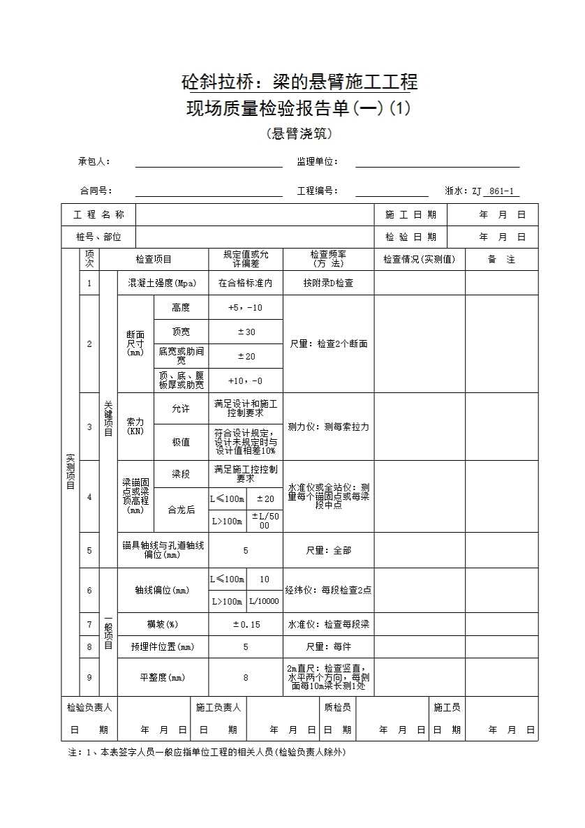 表格名称:浙水:ZJ861-1 砼斜拉桥:梁的悬臂施工工程现场质量检验报告单(一)(1)