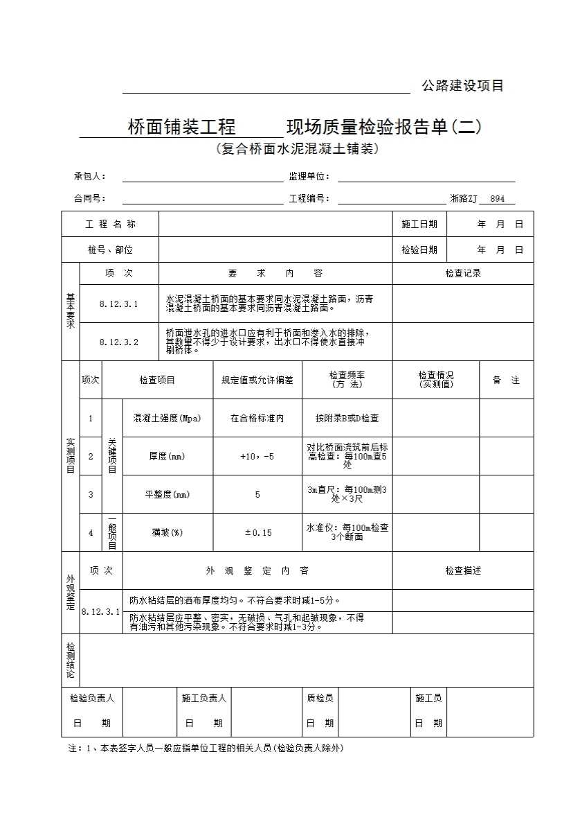 表格名称:浙路ZJ894 桥面铺装工程现场质量检验报告单(二)