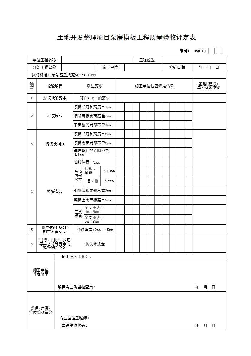 表格名称:土地开发整理项目泵房模板工程质量验收评定表
