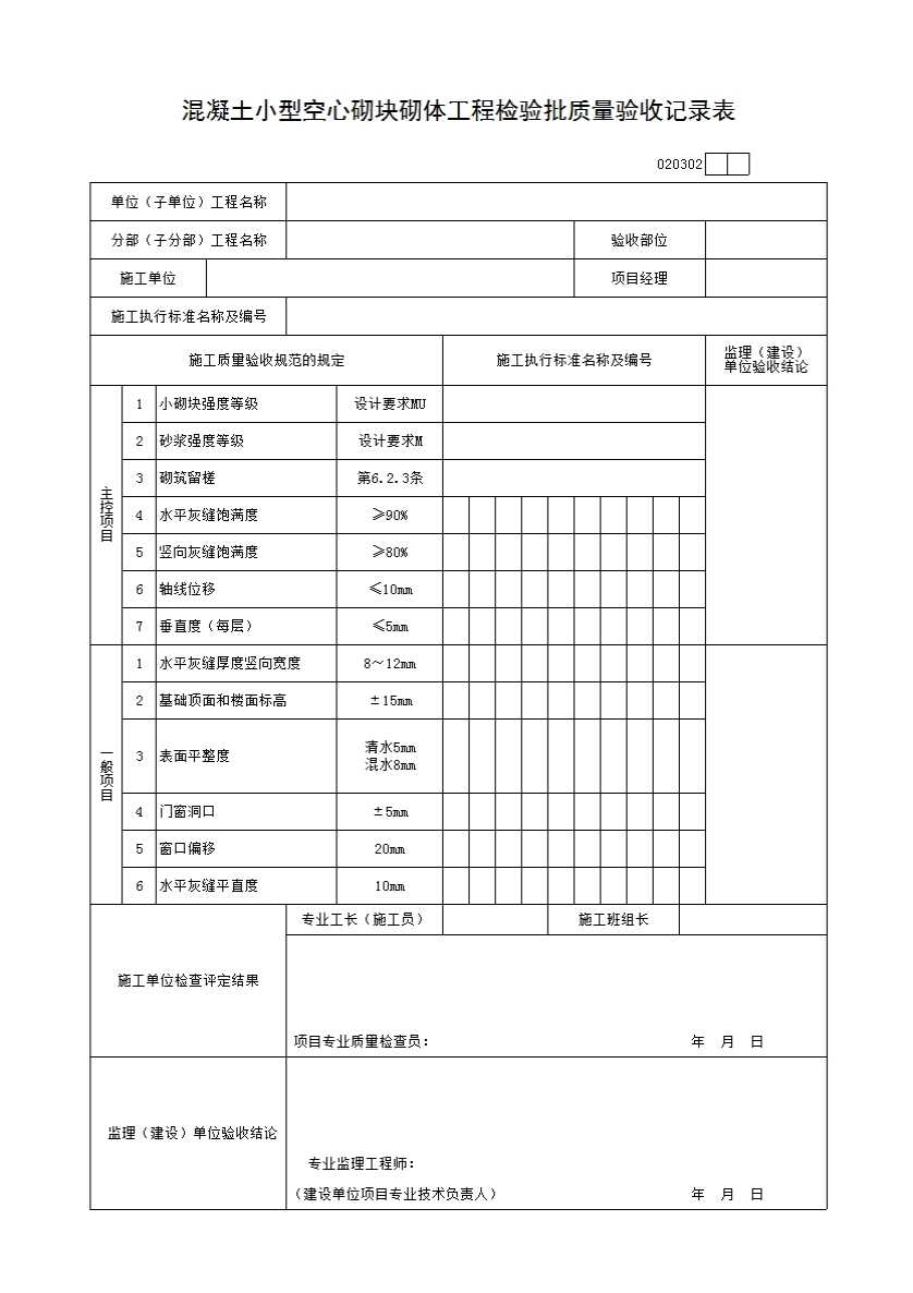 表格名称:020302 混凝土小型空心砌块砌体工程检验批质量验收记录表