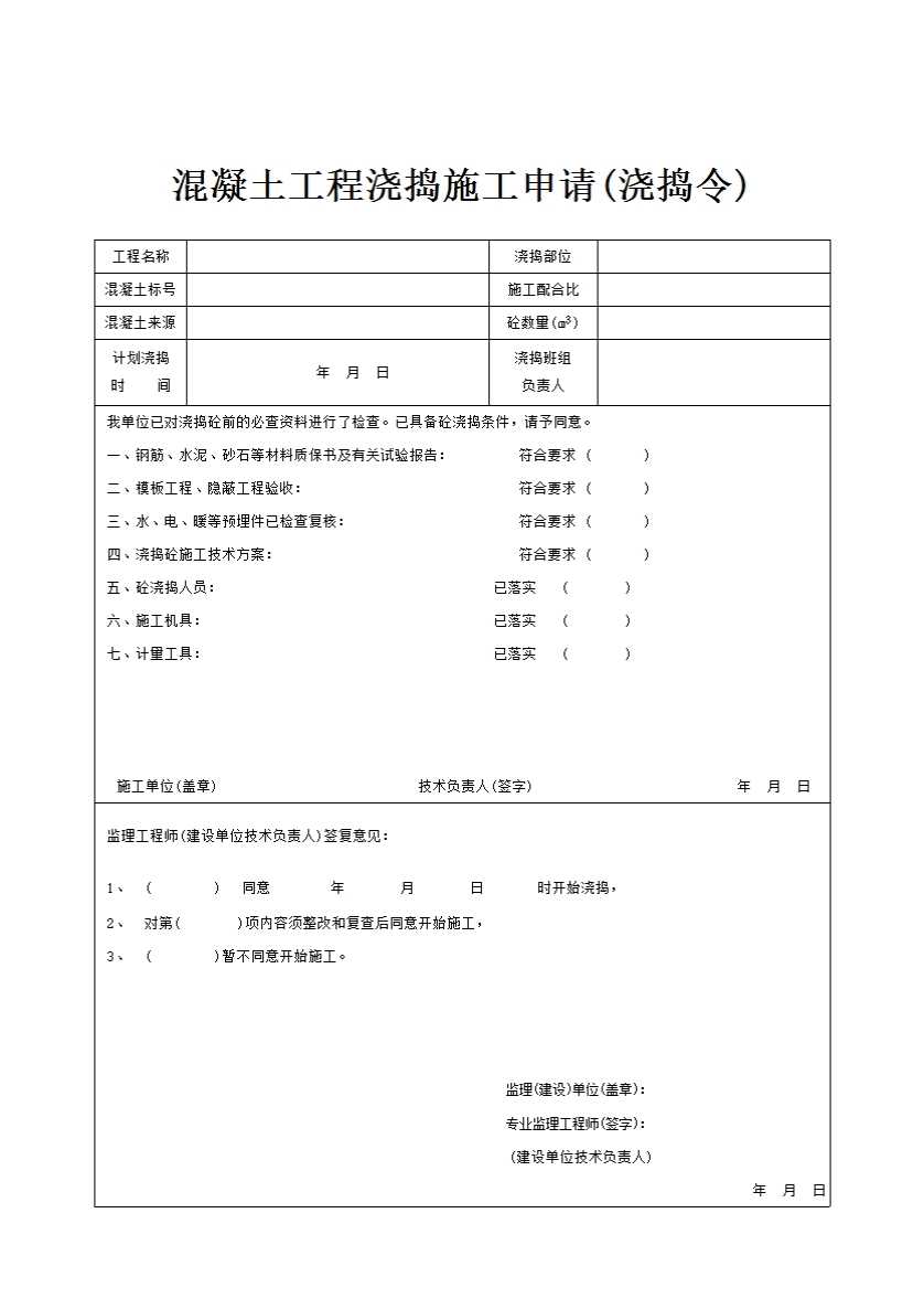 表格名称:混凝土工程浇捣施工申请(浇捣令)