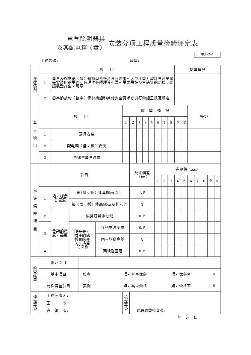表格名称:电气照明器具及其配电箱(盘)安装分项工程质量检验评定表