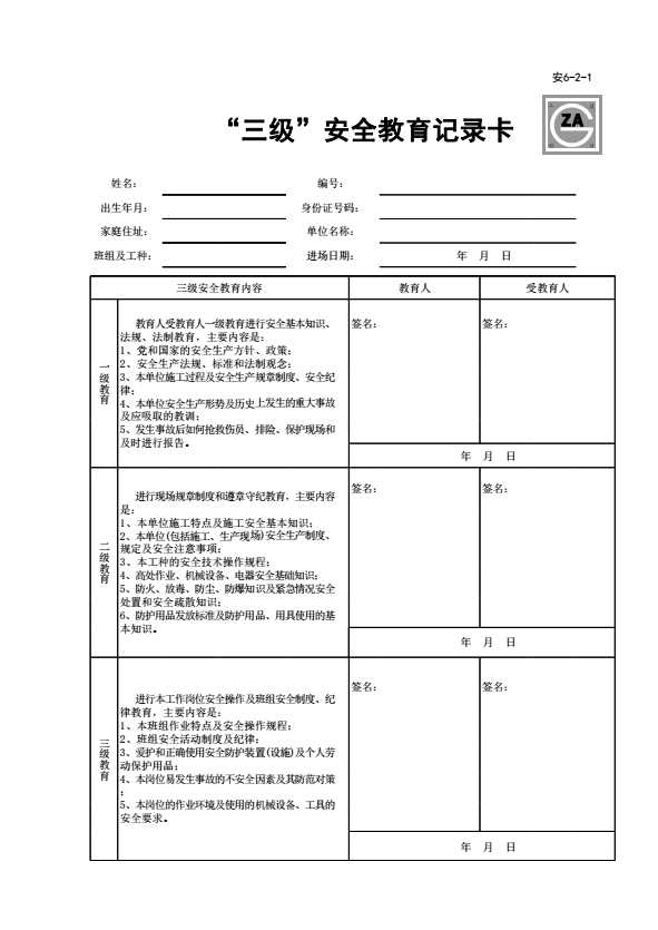 安6-2-1_“三级”安全教育记录卡