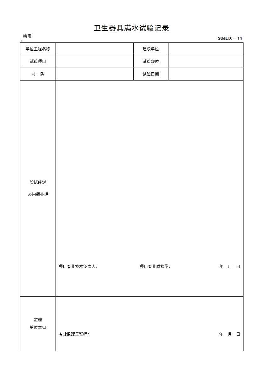 卫生器具满水试验记录