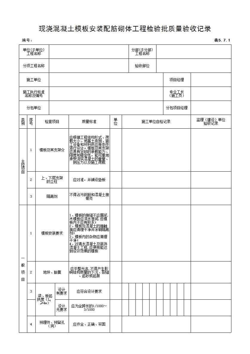 表格名称:5.7.1 现浇混凝土模板安装配筋砌体工程检验批质量验收记录