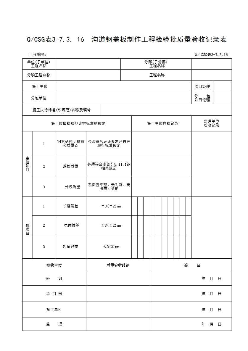 表格名称:QCSG 表 3-7.3.16 沟道钢盖板制作工程检验批质量验收记录表
