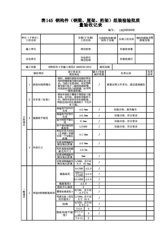 表格名称:130202030402 钢构件(钢梁、屋架、桁架)组装检验批质量验收记录