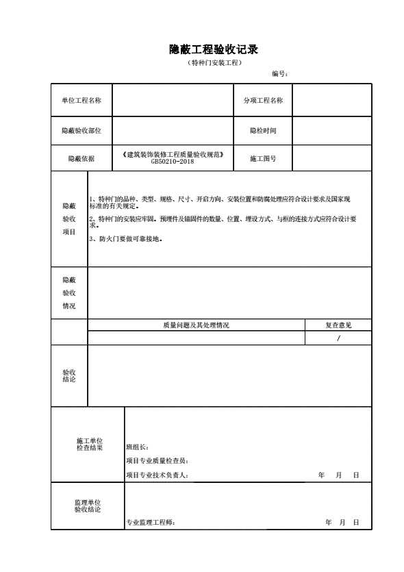 表格名称:隐蔽工程验收记录(特种门安装工程)