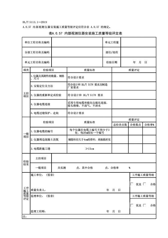表格名称:表A.0.57 内部观测仪器安装施工质量等级评定表