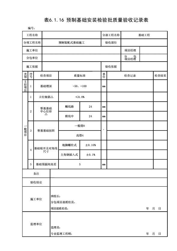 表格名称:表6.1.16 预制基础安装检验批质量验收记录表