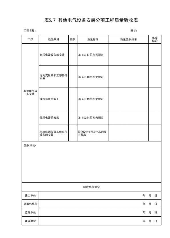 表格名称:表5.7 其他电气设备安装分项工程质量验收表