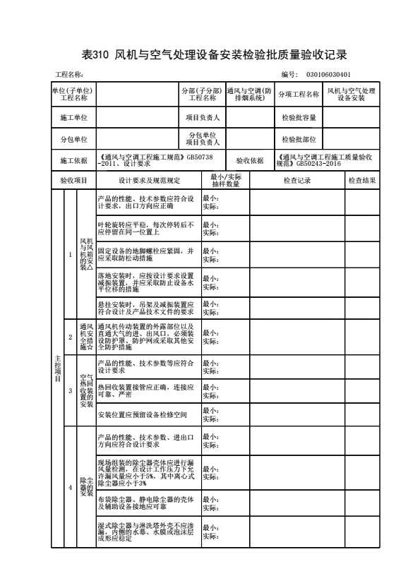 表格名称:030106030401 风机与空气处理设备安装检验批质量验收记录