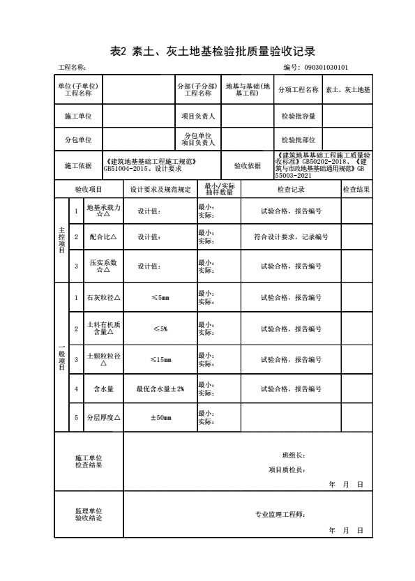 表格名称:090301030101 素土、灰土地基检验批质量验收记录