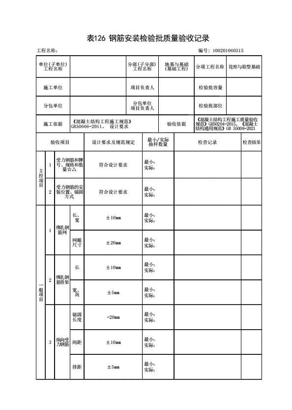 表格名称:100201060315 钢筋安装检验批质量验收记录