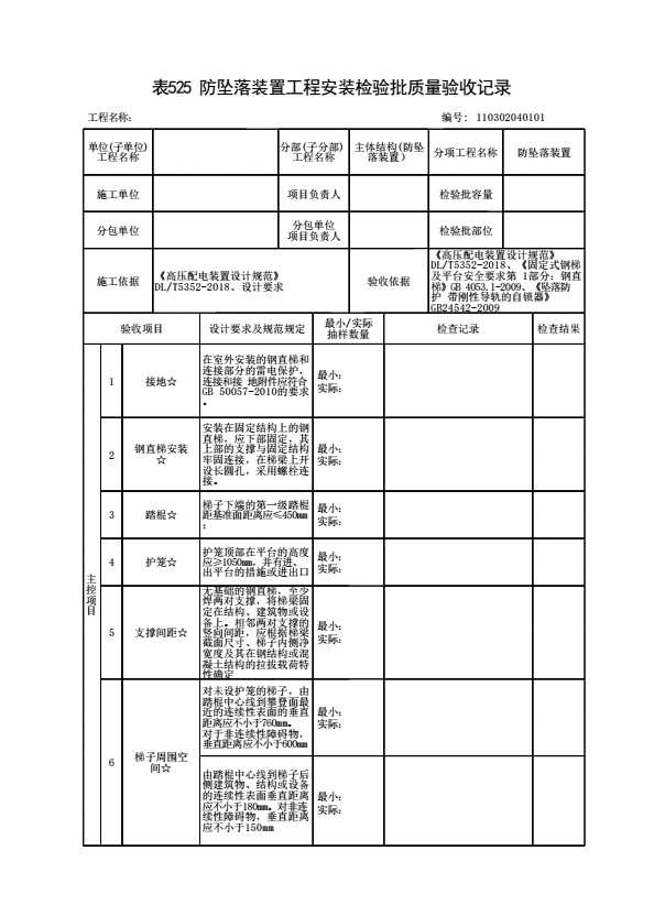 表格名称:110302040101 防坠落装置工程安装检验批质量验收记录