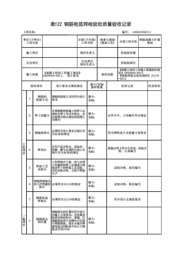 表格名称:130301050111 钢筋电弧焊检验批质量验收记录