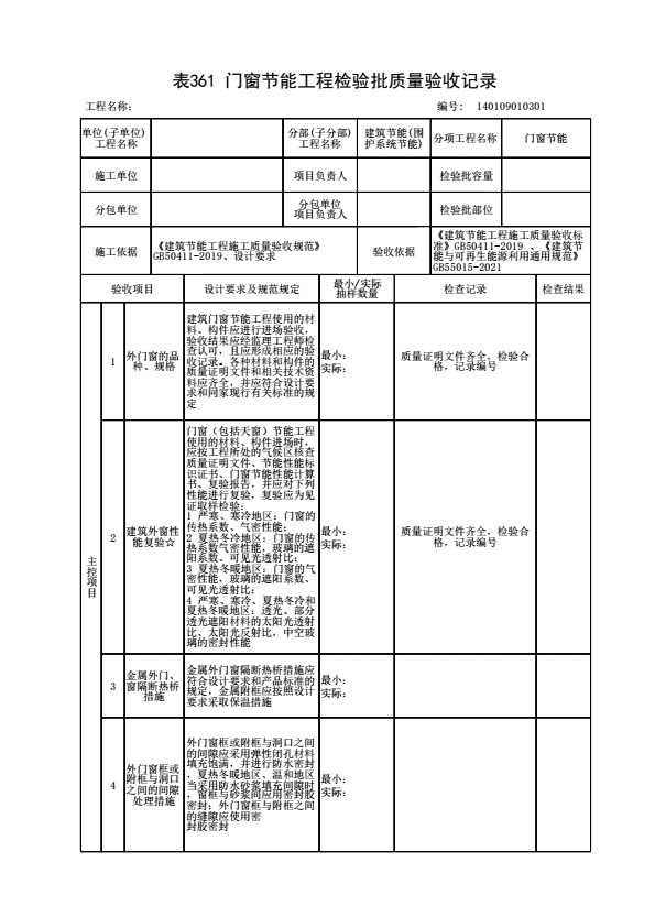 表格名称:140109010301 门窗节能工程检验批质量验收记录