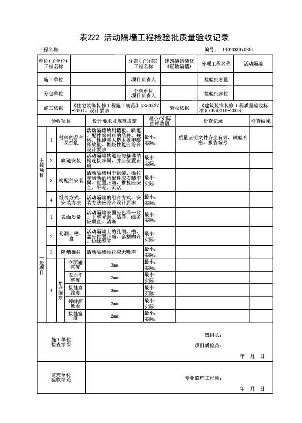 表格名称:140203070301 活动隔墙工程检验批质量验收记录