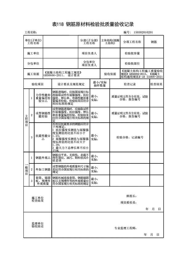 表格名称:150302010201 钢筋原材料检验批质量验收记录