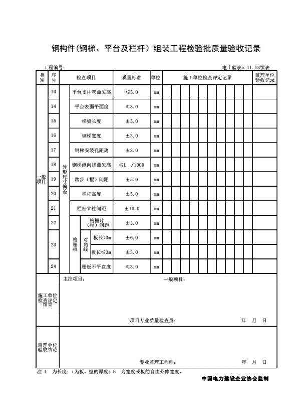 表格名称:电土验表5.11.13 钢构架(钢梯、平台及栏杆)组装工程检验批质量验收记录